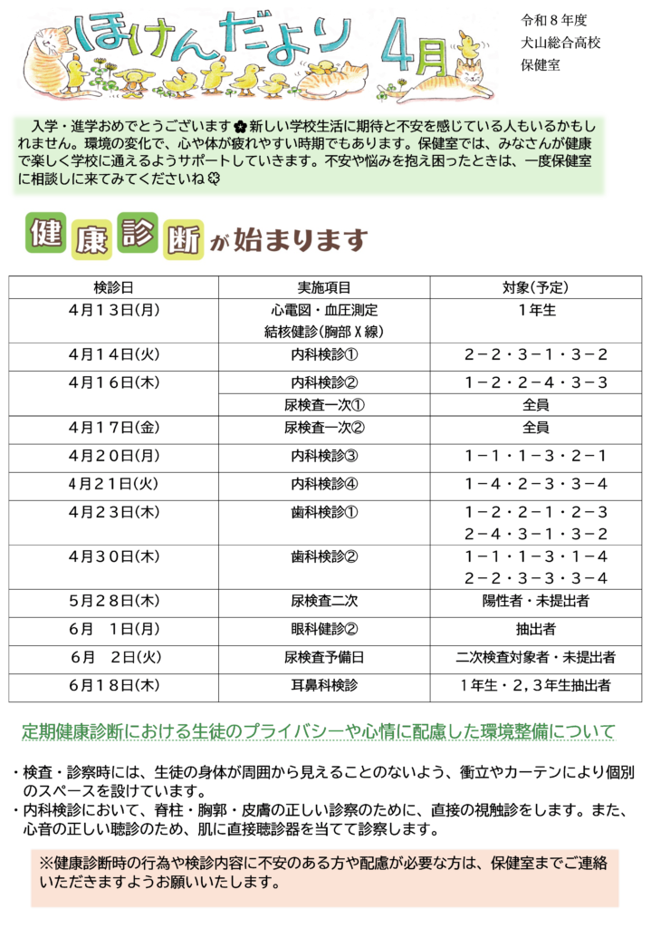 さて、今月の保健だよりは「健康診断について」です。みなさんご確認よろしくお願いします😌